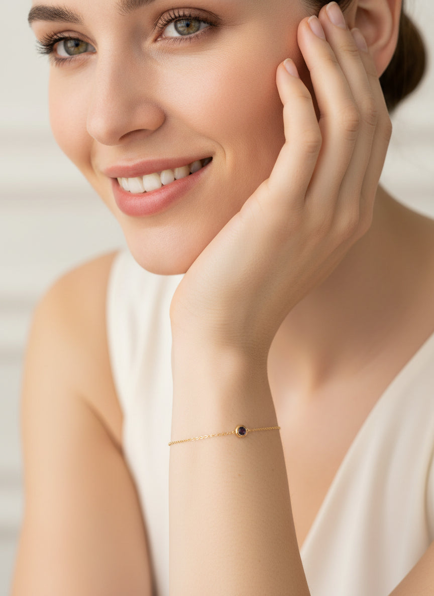 Materials & Details: 14-karat solid yellow or white gold Handcrafted in San Francisco 7 inch chain adjustable to 6 inches Natural Amethyst gemstone * Includes velvet pouch and CHAKRA intention card.