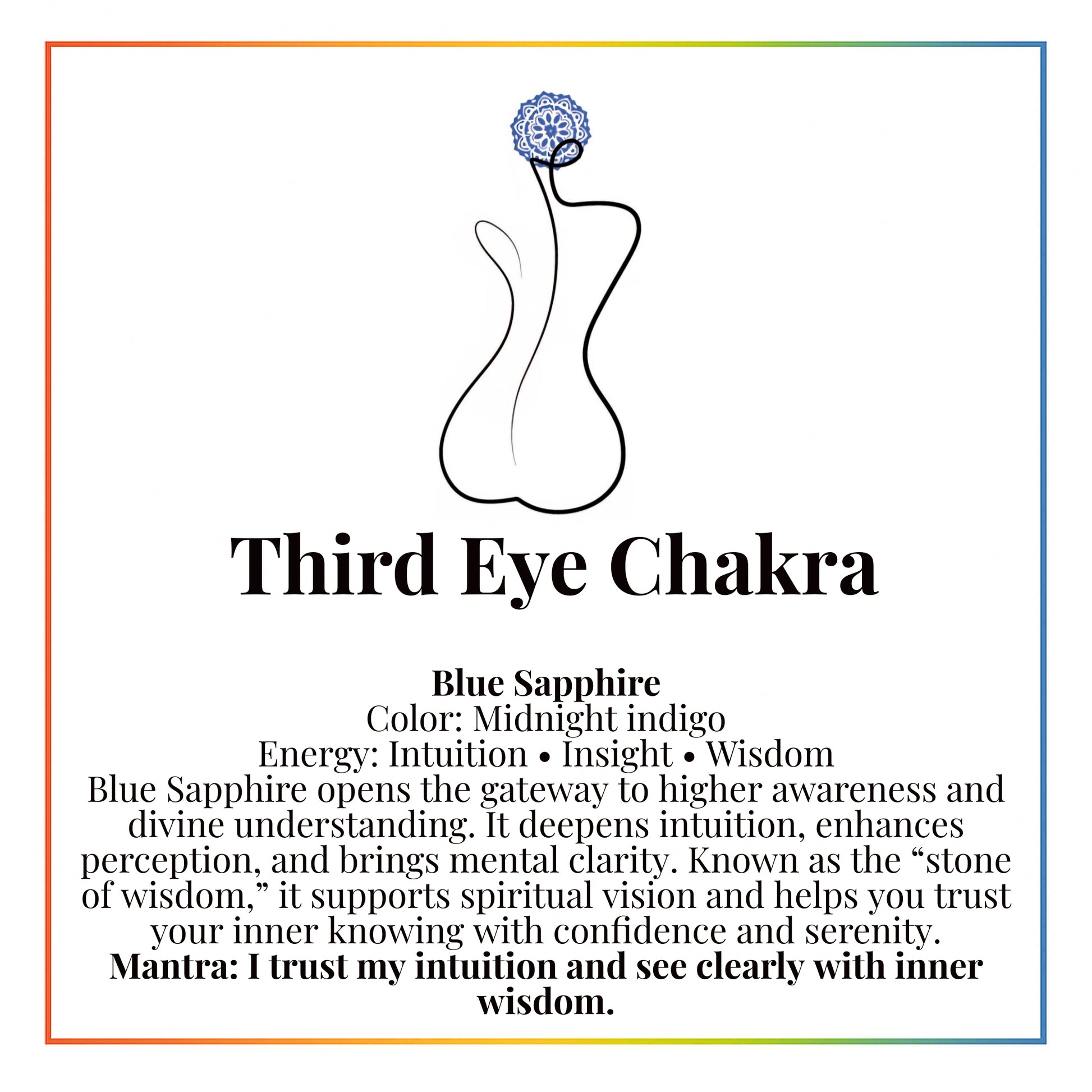 Meaning: The Third Eye Chakra enhances insight, intuition, and higher awareness. Breathe in deep indigo blue to expand your inner vision.